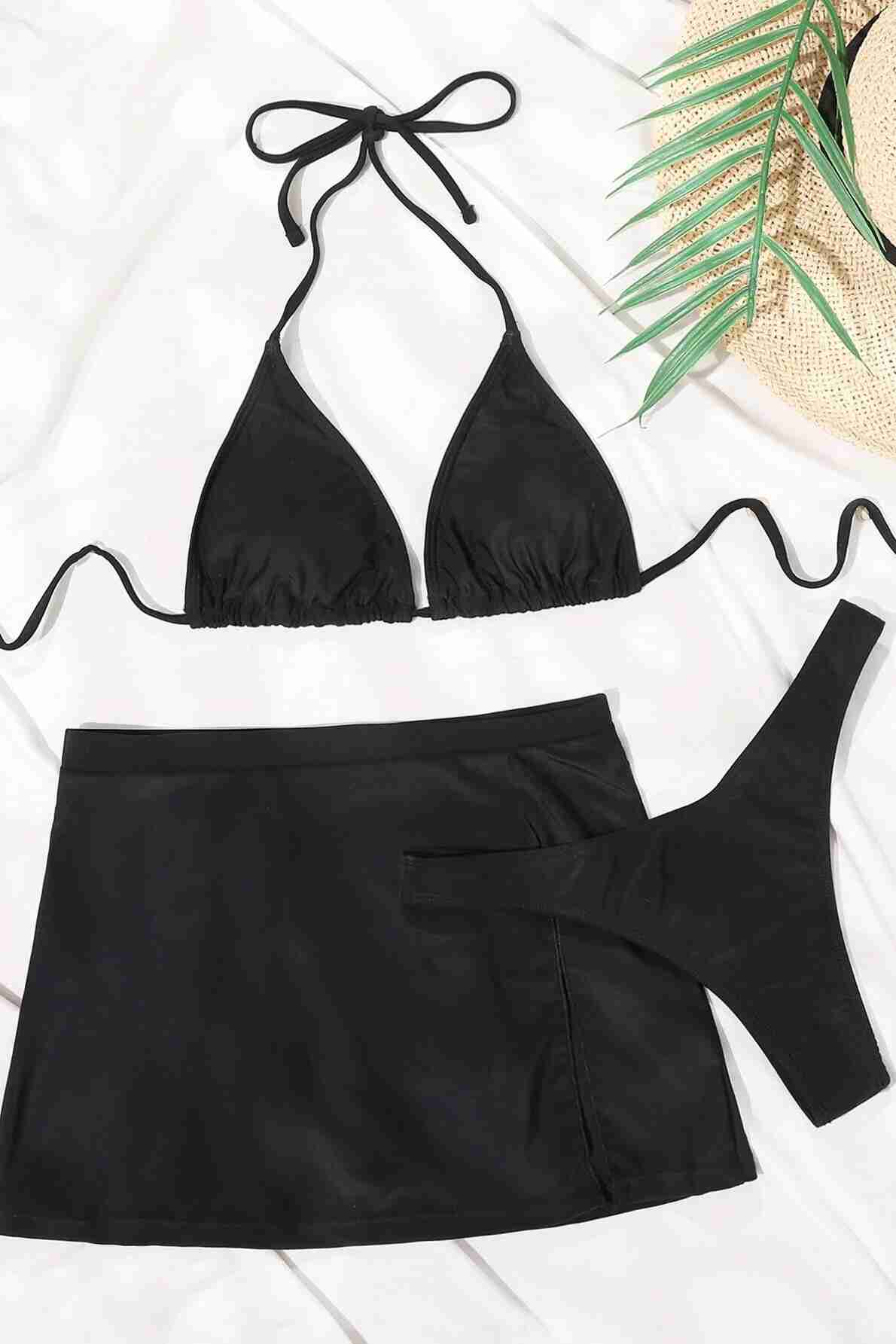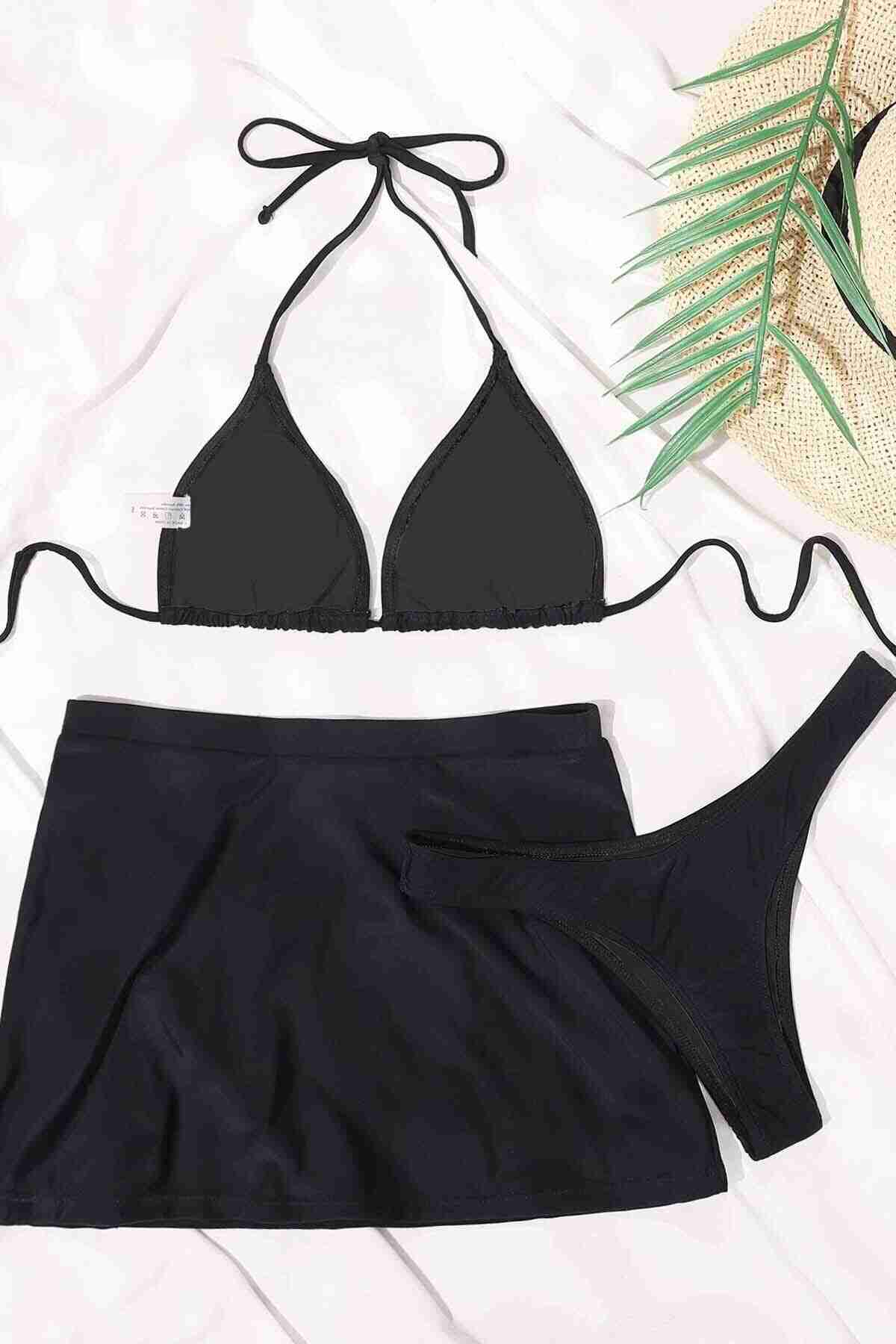 Angelsin Deniz Etekli 3 lü Bikini Takım (Çıkartılabilir Kaplı) Siyah - MS4392-Siyah