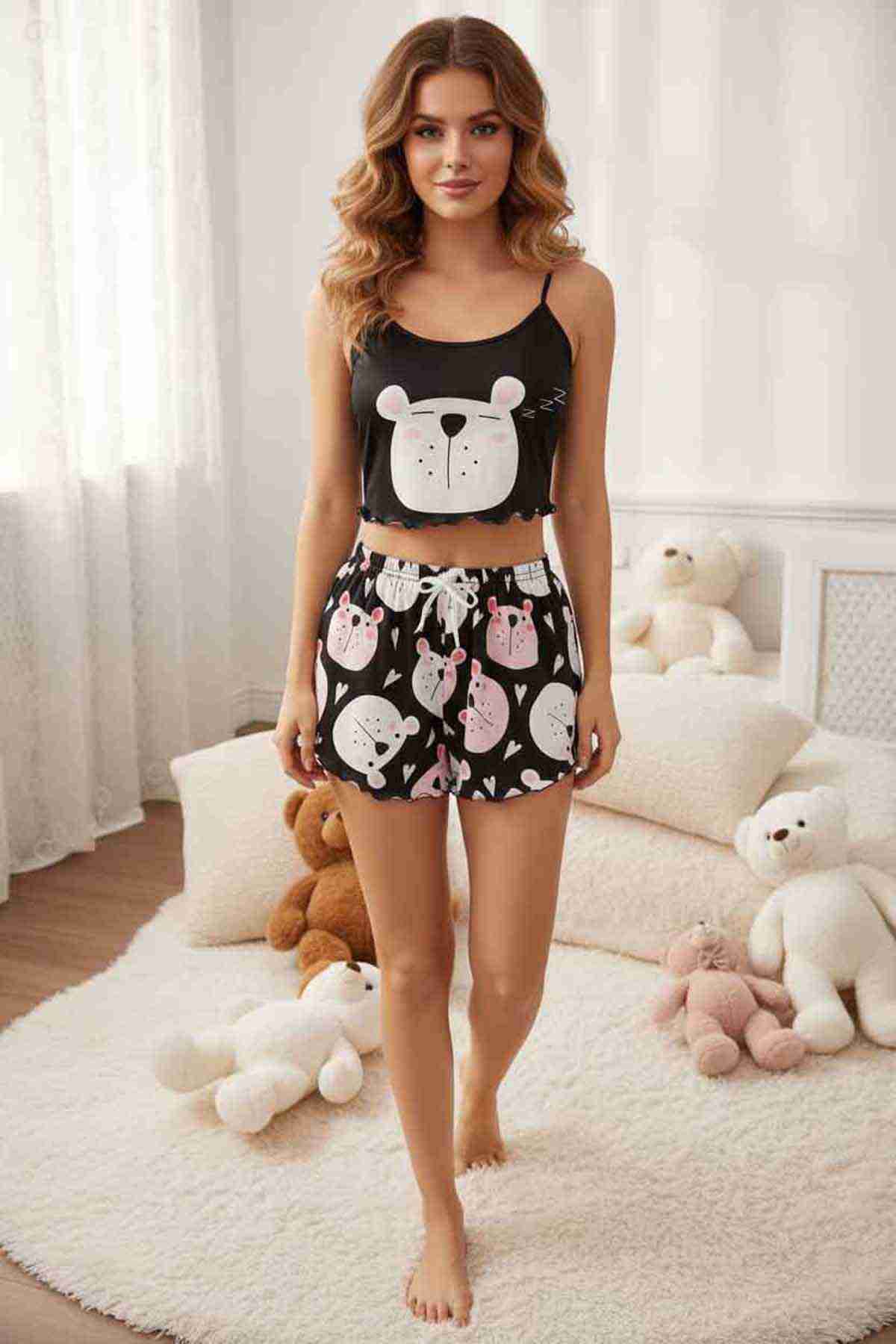 Merry See Uyuyan Ayıcık Basklı Ultrasoft Askılı Sortlu Pijama Takımı Çok Renkli - MS4073-Çok Renkli